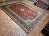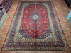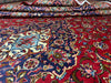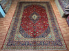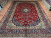 This 10'0" × 14'4" hand-knotted Persian wool rug showcases a striking red field with an ornate central medallion framed by a navy border filled with intricate floral patterns. The craftsmanship highlights the elegance of traditional Persian weaving, blending vibrant tones of red, navy, gold, and ivory for a regal statement piece. Ideal for larger spaces such as dining rooms, formal living rooms, or executive offices, this rug adds grandeur and warmth.