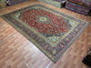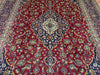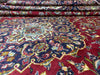 This 9'7" × 13'2" hand-knotted wool rug showcases a classic Persian design with a deep red backdrop and a central floral medallion. Framed by intricate navy and ivory borders with detailed motifs, this rug brings timeless elegance and warmth to any space. The fine hand-knotting and dense wool pile ensure both luxury and long-lasting durability, making it a statement piece for large living or dining areas.