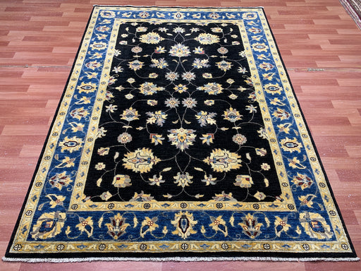 Original price $2,585.00 - Original price $2,585.00Original price$2,585.00$2,585.00 - $2,585.00Current price $2,585.00| /5'7" × 7'8" Hand-Knotted Wool Rug – Black Field with Blue & Gold Floral Border