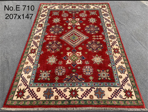 Exclusive ArrivalArrives Nov 7th, 2025 — In-store reservation4’10” x 6’9” Hand-Knotted Kazak Wool Rug – Deep Red with Geometric Motifs