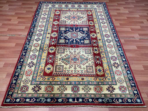 Original price $2,550.00 - Original price $2,550.00Original price$2,550.00$2,550.00 - $2,550.00Current price $2,550.00| /5'4" × 7'11" Hand-Knotted Kazak Wool Rug – Ivory, Red & Navy Geometric Design