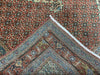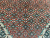 This 6’5” × 9’4” hand-knotted wool rug features a striking rust-red field decorated with an intricate all-over lattice pattern. At its center lies a teal diamond medallion that creates a bold focal point, while the corners echo the same teal tones for balance. The border is adorned with detailed motifs, including stylized animal figures and geometric vinework, giving the rug a rare and unique character. Its earthy palette of rust, teal, ivory, and muted blues makes it suitable for both traditional and eclectic interiors.