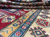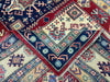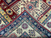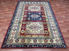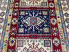 This 5'4" × 7'11" hand-knotted Kazak rug features an ivory field with striking red and navy geometric medallions. Accented with bold tribal borders and detailed motifs in gold, teal, and rust, this rug brings warmth and authenticity to any space.