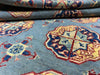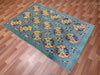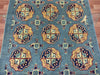 This 3'11" × 5'11" hand-knotted wool rug presents a muted gray backdrop decorated with repeating geometric medallions in navy blue, golden yellow, and rust-red accents. Its striking tribal aesthetic and durable wool pile make it a versatile statement piece for both modern and traditional spaces.