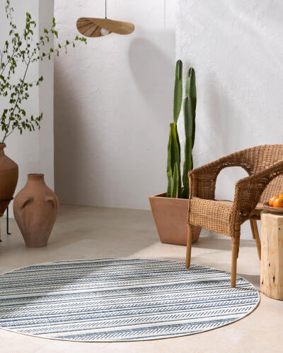 Refresh your indoor–outdoor spaces with the crisp, coastal appeal of the Eagean EAG-2337 rug. Its striped pattern—woven in layered tones of blue, i...