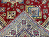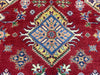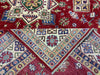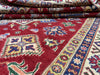 This 6'5" × 9'5" hand-knotted Kazak rug features a deep red field with bold geometric medallions and tribal motifs in blue, green, ivory, and gold. The ivory border frames the design with contrast and balance, creating a vibrant statement rug perfect for living rooms, dining rooms, or entryways.
